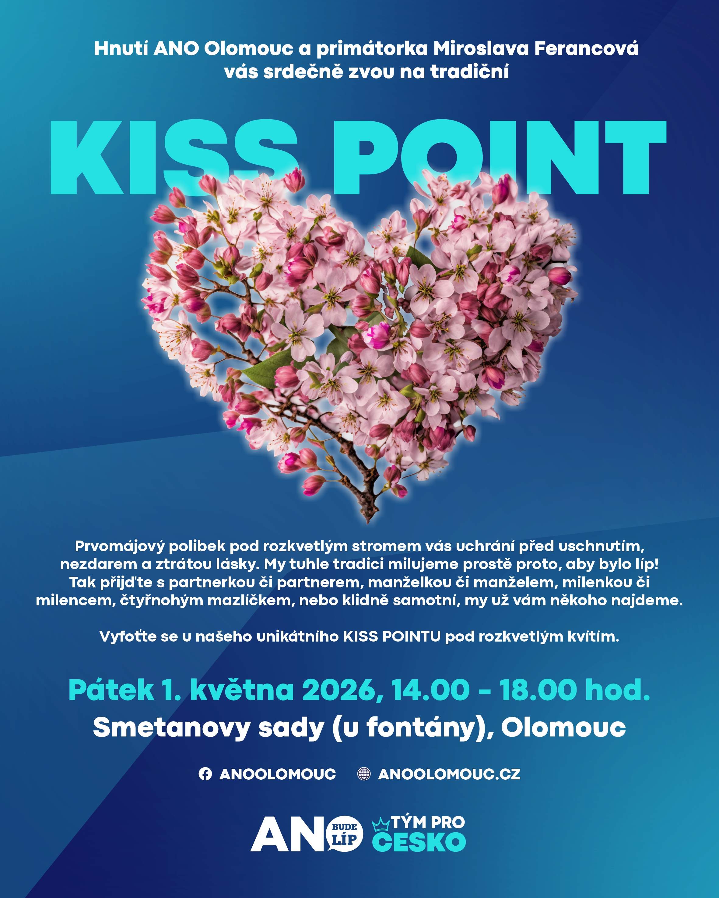 Prvomájový polibek pod rozkvetlým stromem vás uchrání před uschnutím, nezdarem a ztrátou lásky. My tuhle tradici milujeme prostě proto, aby bylo líp! Tak přijďte s partnerkou či partnerem, manželkou či manželem, milenkou či milencem, čtyřnohým mazlíčkem, nebo klidně samotní, my už vám někoho najdeme. Náš tradiční Kiss Point najdete v pátel 1. května ve Smetanových sadech – park Flora, u fontány. Budou opět perníčky a dílničky pro děti.